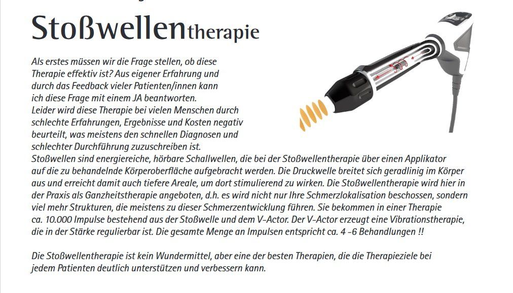 In einer Behandlung bekommt Ihr Gewebe/ Ihre Struktur ca. 10000 Impulse verabreicht. Wir arbeiten ganzheitlich mit der Stoßwelle um möglichst viel zu erreichen.
